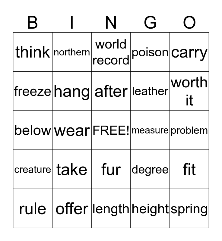This bingo card has a free space and 24 words: take, offer, after, rule, carry, think, freeze, northern, measure, fur, leather, below, degree, fit, hang, height, problem, world record, worth it, wear, spring, creature, poison and length.