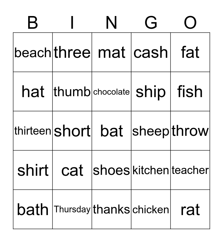 This bingo card has a free space and 24 words: cat, Thursday, chocolate, bath, fat, beach, hat, three, sheep, shoes, ship, thirteen, kitchen, teacher, thumb, chicken, throw, mat, fish, short, rat, shirt, cash and thanks.