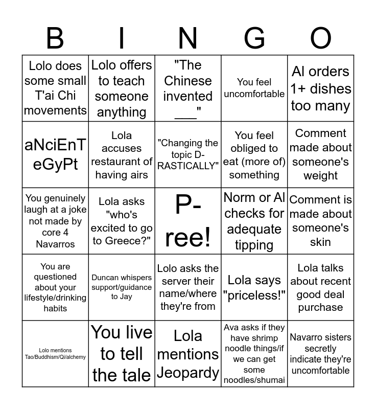 This bingo card has a free space and 31 words: Lola mentions Jeopardy, Lolo speaks to the server in Mandarin, Lola asks "who's excited to go to Greece?", Lolo mentions Delphi, Lolo does some small T'ai Chi movements, "The Chinese invented ___", Lola accuses restaurant of having airs, Lola says "priceless!", Norm or Al checks for adequate tipping, Ava asks if they have shrimp noodle things/if we can get some noodles/shumai, Comment is made about someone's skin, Navarro sisters secretly indicate they're uncomfortable, Duncan/Jay mentions they are an excellent dancer, Isabel/Ava whispers to sister/SO, Comment made about someone's weight, Norm and Jen talk about their vacation (past or future), Lola talks about recent good deal purchase, Duncan whispers support/guidance to Jay, You are questioned about your lifestyle/drinking habits, Lolo asks the server their name/where they're from, Al orders 1+ dishes too many, Someone gets "angry" that someone else paid the check, Lolo mentions Tao/Buddhism/Qi/alchemy, Lolo offers to teach someone anything, You feel obliged to eat (more of) something, aNciEnT eGyPt, You feel uncomfortable, You genuinely laugh at a joke not made by core 4 Navarros, You live to tell the tale, "Changing the topic D-RASTICALLY" and Someone is "gifted" something unsolicited.