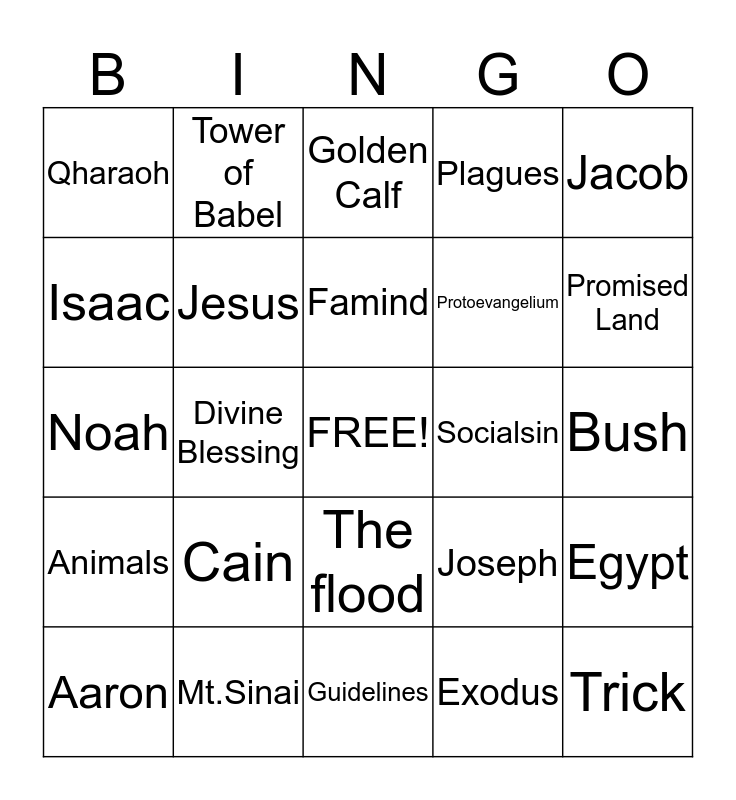 This bingo card has a free space and 24 words: Cain, Mt.Sinai, Famind, Aaron, Jacob, Qharaoh, Isaac, Tower of Babel, Socialsin, The flood, Protoevangelium, Noah, Joseph, Egypt, Jesus, Exodus, Bush, Golden Calf, Promised Land, Divine Blessing, Trick, Animals, Plagues and Guidelines.