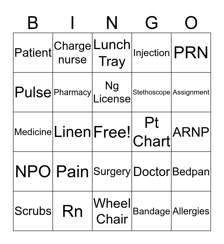 This bingo card has a free space and 24 words: Pain, Rn, Ng License, Scrubs, PRN, Patient, Pulse, Charge nurse, Pt Chart, Surgery, Stethoscope, Medicine, Doctor, Bedpan, Pharmacy, Bandage, ARNP, Lunch Tray, Assignment, Linen, Allergies, NPO, Injection and Wheel Chair.