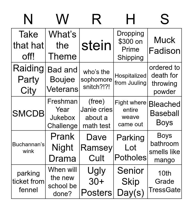 This bingo card has a free space and 29 words: parking ticket from fennel, “real” “fake” lockdowns, Freshman Year Jukebox Challenge, APUSH is a Cult, Take that hat off!, stein, Bad and Boujee Veterans, Prank Night Drama, Fight where entire weave came out, When will the new school be done?, Bleached Baseball Boys, 10th Grade TressGate, Ugly 30+ Posters, Senior Skip Day(s), ordered to death for throwing powder, Fighting the Conselour, Dave Ramsey Cult, Buchannan’s wink, Muck Fadison, SMCDB, Parking Lot Potholes, MB, Ashya, & Janie fight over Carter, Hospitalized from Juuling, Raiding Party City, Dropping $300 on Prime Shipping, What’s the Theme, Boys bathroom smells like mango, who’s the sophomore snitch?!?! and Buying hours for clubs.