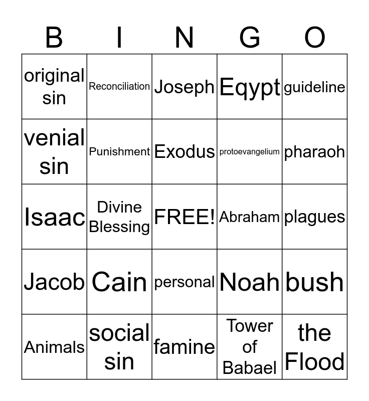 This bingo card has a free space and 24 words: Cain, social sin, Exodus, Animals, guideline, original sin, venial sin, Reconciliation, Abraham, personal, protoevangelium, Isaac, Noah, bush, Punishment, Tower of Babael, plagues, Joseph, pharaoh, Divine Blessing, the Flood, Jacob, Eqypt and famine.
