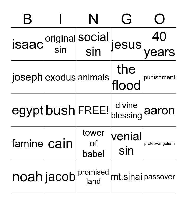 This bingo card has a free space and 24 words: cain, jacob, animals, noah, 40 years, isaac, joseph, original sin, divine blessing, tower of babel, the flood, egypt, venial sin, protoevangelium, exodus, mt.sinai, aaron, social sin, punishment, bush, passover, famine, jesus and promised land.