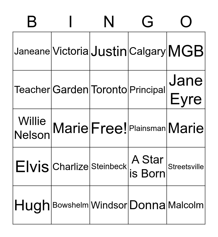 This bingo card has a free space and 29 words: Hugh, Helen, Marie, Jeff, Janeane, Justin, Garden, Charlize, Plainsman, Bowshelm, Marie, Malcolm, Windsor, Donna, Jane Eyre, Margaret Atwood, Steinbeck, Elvis, MGB, Willie Nelson, A Star is Born, Oprah Chopra, Principal, Teacher, Calgary, Victoria, Streetsville, Toronto and Detroit.