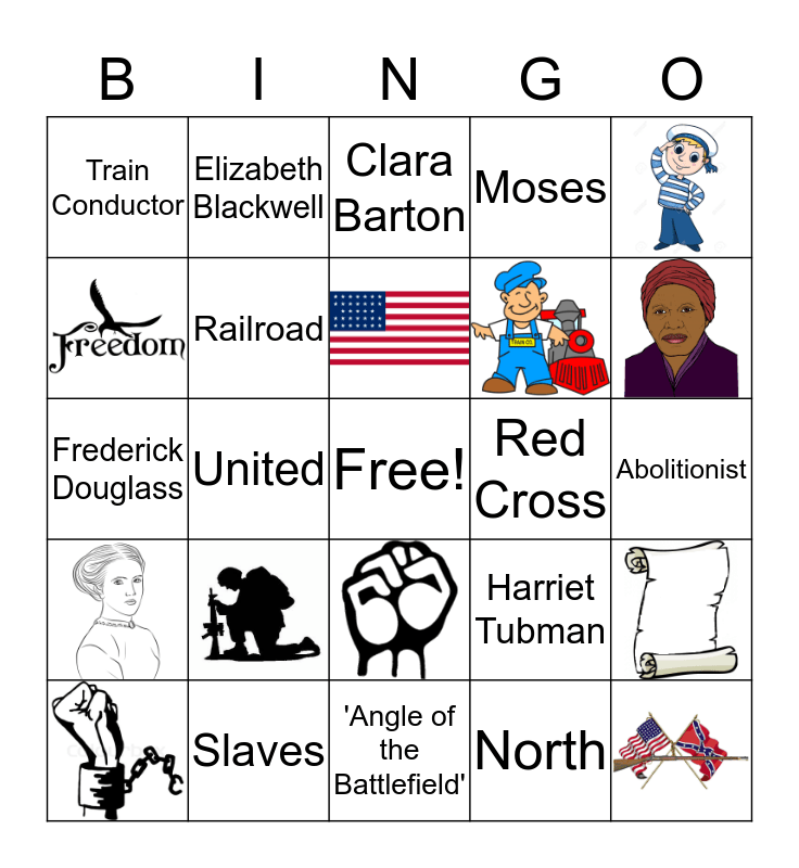 This bingo card has 17 images, a free space and 17 words: North, Civil War, South, Railroad, Elizabeth Blackwell, Clara Barton, Education, Red Cross, Slaves, Frederick Douglass, Harriet Tubman, Train Conductor, Abolitionist, 'Angle of the Battlefield', Moses, United and Emancipation Proclamation.