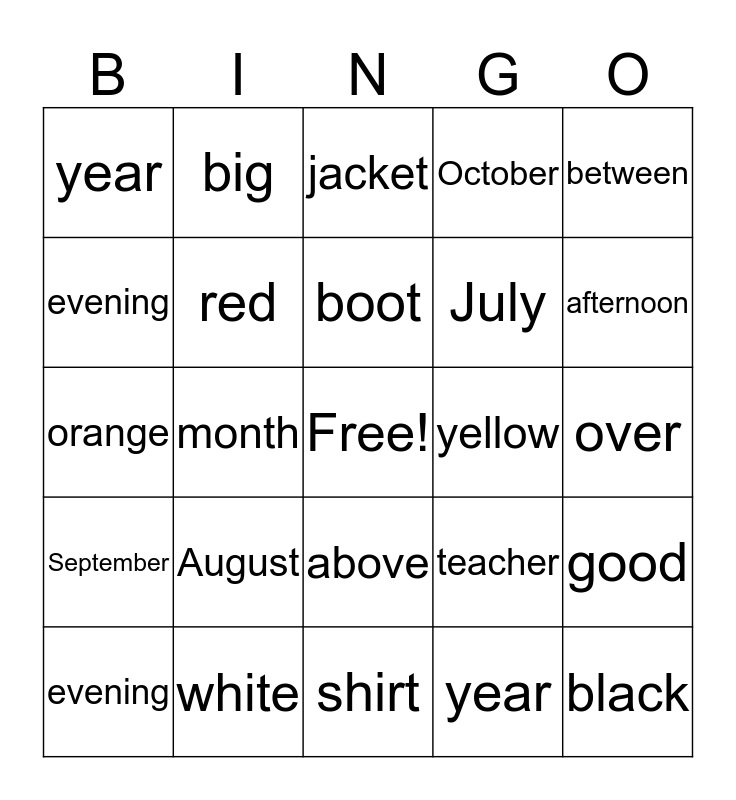 This bingo card has a free space and 64 words: english, sad, happy, good, bad, little, big, jacket, boot, shoes, above, behind, over, between, afternoon, evening, month, year, season, July, August, September, October, November, December, Winter, Spring, Summer, Fall, above, behind, over, between, morning, afternoon, evening, month, year, season, red, orange, yellow, green, blue, purple, black, white, brown, teacher, candy, flowers, heart, shirt, pants, shoes, boot, jacket, big, little, good, bad, happy, sad and english.