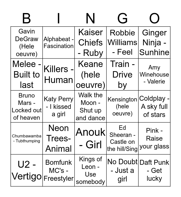 This bingo card has 25 words: Neon Trees-Animal, Kings of Leon - Use somebody, Keane (hele oeuvre), U2 - Vertigo, Ginger Ninja - Sunhine, Gavin DeGraw (Hele oeuvre), Melee - Built to last, Alphabeat - Fascination, Kensington (hele oeuvre), Anouk - Girl, Train - Drive by, Bruno Mars - Locked out of heaven, Ed Sheeran - Castle on the hill/Sing, Pink - Raise your glass, Killers - Human, Daft Punk - Get lucky, Coldplay - A sky full of stars, Kaiser Chiefs - Ruby, Amy Winehouse - Valerie, Katy Perry - I kissed a girl, Walk the Moon - Shut up and dance, Bomfunk MC's - Freestyler, Chumbawamba - Tubthumping, Robbie Williams - Feel and No Doubt - Just a girl.