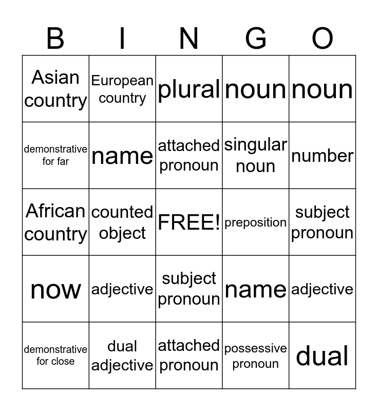 This bingo card has a free space and 24 words: adjective, dual adjective, attached pronoun, demonstrative for close, noun, Asian country, demonstrative for far, European country, preposition, subject pronoun, singular noun, African country, name, adjective, name, possessive pronoun, subject pronoun, plural, number, counted object, dual, now, noun and attached pronoun.