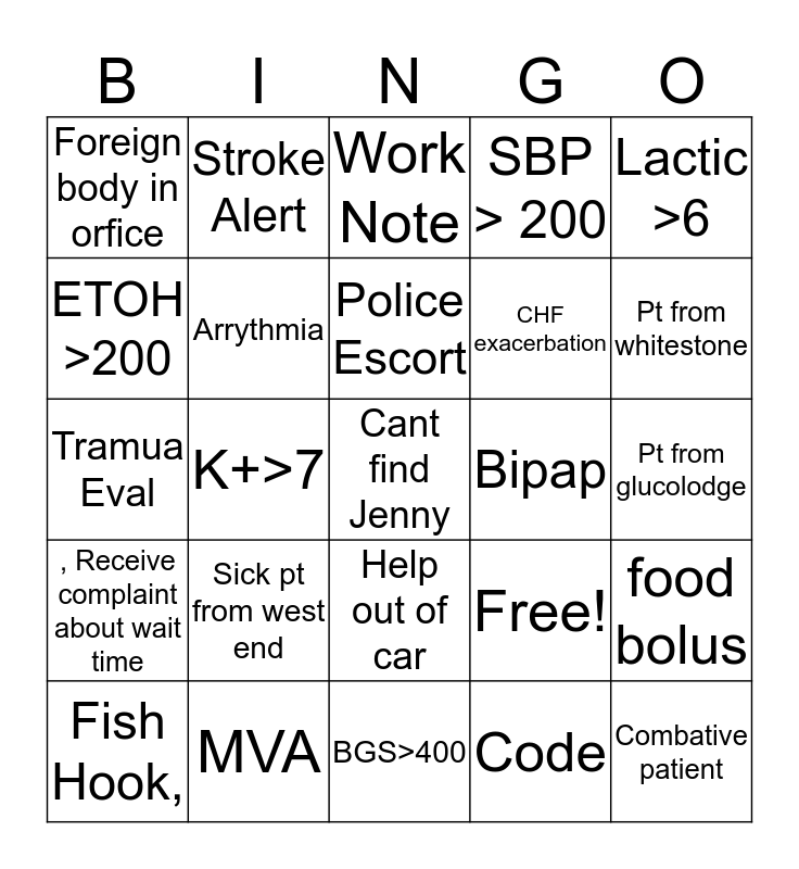 This bingo card has 25 words: Sick pt from west end, BGS>400, Police Escort, Fish Hook,, Lactic >6, Foreign body in orfice, ETOH >200, Stroke Alert, Bipap, Help out of car, CHF exacerbation, Tramua Eval, Free!, food bolus, Arrythmia, Combative patient, Pt from glucolodge, Work Note, Pt from whitestone, K+>7, Cant find Jenny, MVA, , Receive complaint about wait time, SBP > 200 and Code.