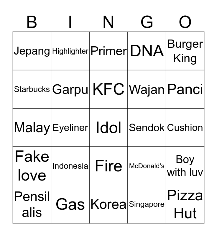 This bingo card has 25 words: Indonesia, Korea, KFC, Pensil alis, Burger King, Jepang, Starbucks, Highlighter, Sendok, Fire, Wajan, Malay, McDonald’s, Boy with luv, Garpu, Pizza Hut, Cushion, Primer, Panci, Eyeliner, Idol, Gas, Fake love, DNA and Singapore.