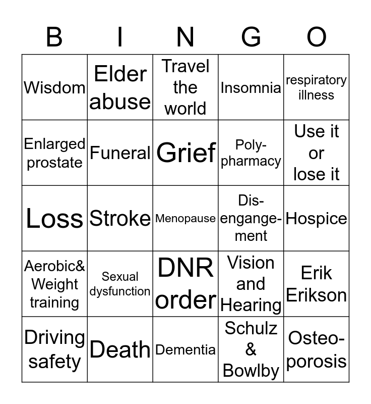 This bingo card has 65 words: Elisabeth kubler Ross, Retirement, Group activities, Erik Erikson, Levinson-fabric of life, Mourning, Elder abuse, 85-99 Old-old, Grief, Dentures, DNR order, Cheyne Stokes respirations, Hospice, respiratory illness, Diverticul- itis, Enlarged prostate, Stroke, Wisdom, mottled extremities, Poly- pharmacy, Sexual dysfunction, Aerobic& Weight training, Insomnia, Carl Rogers Ideal self, Despair, Aging family, 75-84 Old, Stronger family relationship, Menopause, cancer, Driving safety, Integrity, slow pulse, Loevinger- Milestones, Vision and Hearing, Death, Relaxed and open jaw, Loss, Schulz & Bowlby, loose gurgling sounds, Funeral, constipation, Dis- engange-ment, Peck & Havighurst changing lifestyle, Advance directive, Senescence, Use it or lose it, 65-74 young old, Osteo-porosis, heart disease, Condol-ence, 100&older Elite old, Leadership, Dementia, Atchley stages of retirement, assistive devices, Restless leg syndrome, Travel the world, Diabetes, Will, therapeutic presence, Social security, Legacy, Bereave- ment and Seniors.