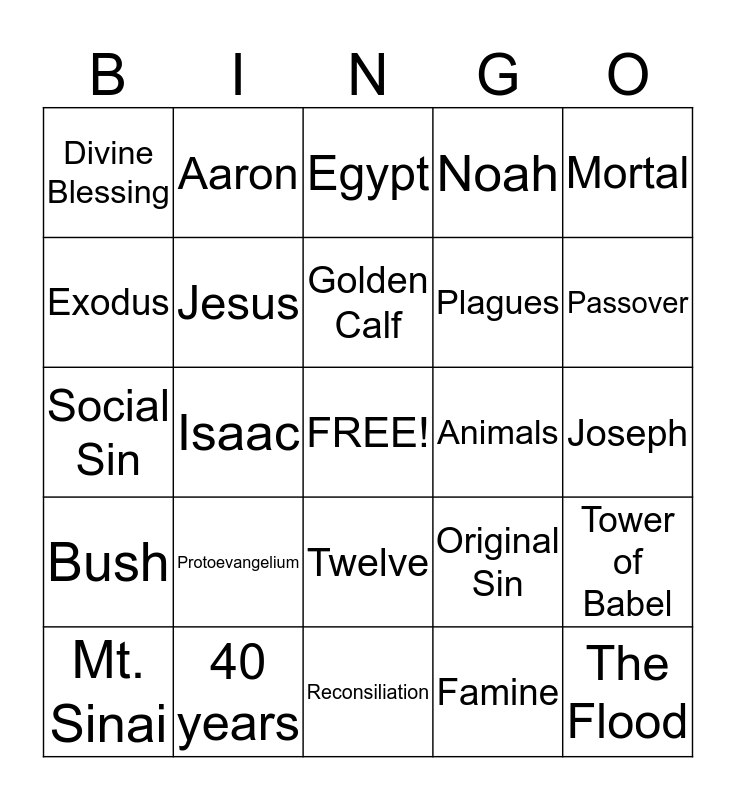 This bingo card has a free space and 24 words: Protoevangelium, 40 years, Golden Calf, Mt. Sinai, Mortal, Divine Blessing, Exodus, Aaron, Animals, Twelve, Plagues, Social Sin, Original Sin, Tower of Babel, Jesus, Famine, Joseph, Egypt, Passover, Isaac, The Flood, Bush, Noah and Reconsiliation.