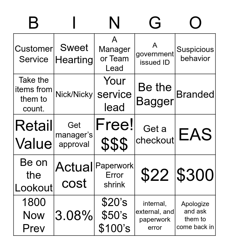 This bingo card has a free space and 34 words: 8, internal, external, and paperwork error, 1.27%, $89,076, Be on the Lookout, Nick/Nicky, Suspicious behavior, 1800 Now Prev, Sweet Hearting, Chris Tytel, Your service lead, A Manager or Team Lead, Aspect, Discount Abuse, Get a checkout, Branded, 3.08%, Retail Value, Actual cost, $22, Paperwork Error shrink, Ask to start them a fitting room., Customer Service, EAS, $20’s $50’s $100’s, Apologize and ask them to come back in, A government issued ID, Grab and Run, Be the Bagger, Take the items from them to count., Any accessories, housewares, and undies, Get manager’s approval, $300 and The LP Binder.