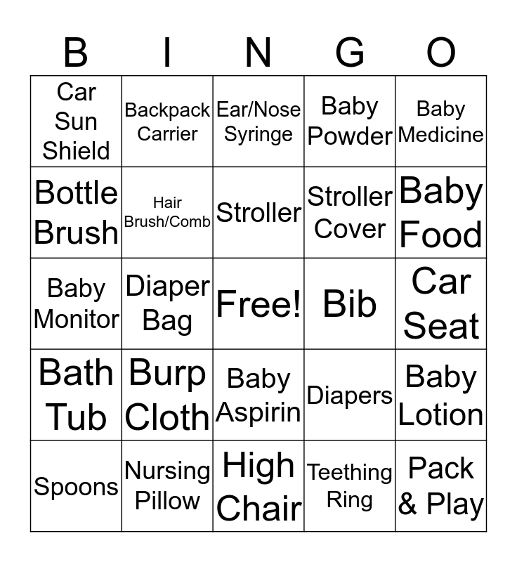 This bingo card has a free space and 48 words: Bottle Drying Rack, Pack & Play, Crib Sheets, High Chair, Burp Cloth, Toys, Backpack Carrier, Sippy Cup, Bottle Brush, Hat, Hair Brush/Comb, Baby Powder, Baby Lotion, Diapers, Pacifier, Booties/Shoes, Stroller, Bib, Thermometer, Baby Medicine, Diaper Bag, Teething Ring, Car Sun Shield, Stroller Cover, Blanket, Baby Food, Spoons, Baby Dishes, Baby Aspirin, Bath Tub, Baby Books, Changing Table Pad, Booster Seat, Humidifier, Nursing Pillow, Sound Machine, Bottles, Car Seat, Baby Bouncer, Baby Socks, Hooded Towel, Rocking Chair, Ear/Nose Syringe, Mobile, Baby Monitor, Safety Locks, Corner Bumpers and Baby Gate.