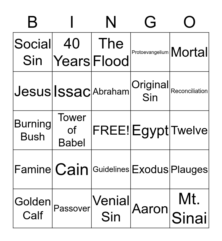 This bingo card has a free space and 24 words: Cain, Passover, Abraham, Golden Calf, Mortal, Social Sin, Jesus, 40 Years, Egypt, Guidelines, Original Sin, Burning Bush, Exodus, Plauges, Issac, Aaron, Twelve, The Flood, Reconciliation, Tower of Babel, Mt. Sinai, Famine, Protoevangelium and Venial Sin.