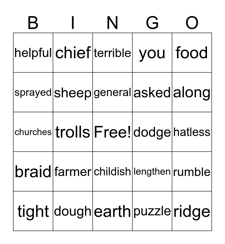 This bingo card has a free space and 34 words: bread, puzzle, purple, goat, braid, sheep, food, tight, chief, slice, general, terrible, world, during, dodge, along, dough, churches, farmer, lengthen, childish, lonely, helpful, hatless, earth, ridge, you, ground, asked, sprayed, mostly, trolls, rumble and cliffs.