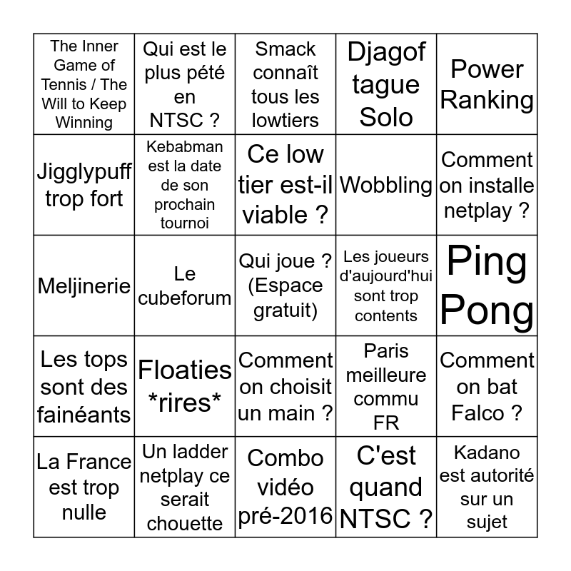 This bingo card has a free space and 28 words: Comment on bat Falco ?, Belia garant de l'intégrité de la langue française, Wobbling, C'est quand NTSC ?, Jigglypuff trop fort, Smack connaît tous les lowtiers, Qui est le plus pété en NTSC ?, Les tops sont des fainéants, Les joueurs d'aujourd'hui sont trop contents, La France est trop nulle, Meljinerie, Djagof tague Solo, Un ladder netplay ce serait chouette, Combo vidéo pré-2016, Comment on installe netplay ?, Comment avoir le jeu chez soi avec UCF / NTSC ?, Floaties *rires*, Kebabman est la date de son prochain tournoi, Ce low tier est-il viable ?, Comment on choisit un main ?, The Inner Game of Tennis / The Will to Keep Winning, Jojo’s, Kadano est autorité sur un sujet, Le cubeforum, Ping Pong, Paris meilleure commu FR, Power Ranking and Tournoi garderie.