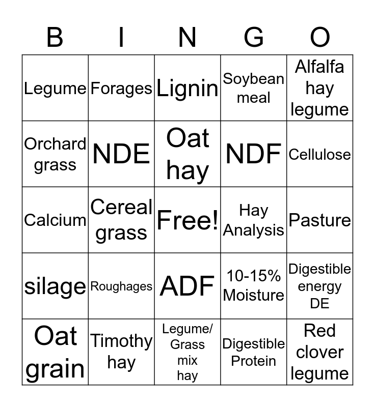 This bingo card has a free space and 24 words: Roughages, Timothy hay, Oat hay, Oat grain, Alfalfa hay legume, Legume, Orchard grass, Forages, Hay Analysis, ADF, NDF, Calcium, 10-15% Moisture, Digestible energy DE, NDE, Digestible Protein, Pasture, Lignin, Cellulose, Cereal grass, Red clover legume, silage, Soybean meal and Legume/ Grass mix hay.