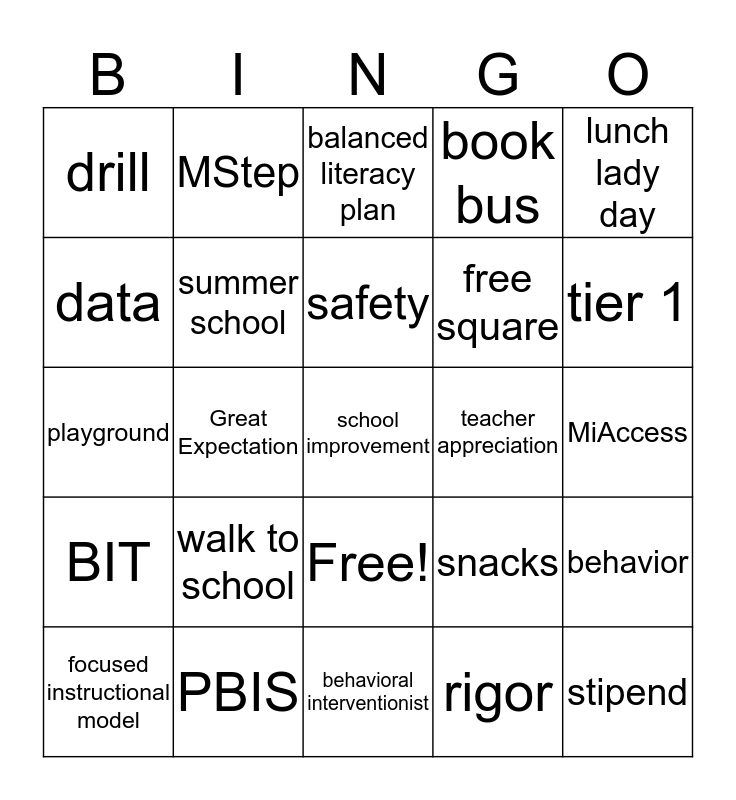 This bingo card has 26 words: Free!, rigor, safety, PBIS, lunch lady day, drill, data, MStep, MiAccess, snacks, free square, playground, behavior, focused instructional model, Great Expectation, summer school, book bus, BIT, balanced literacy plan, school improvement, tier 1, behavioral interventionist, teacher appreciation, walk to school, summer school and stipend.