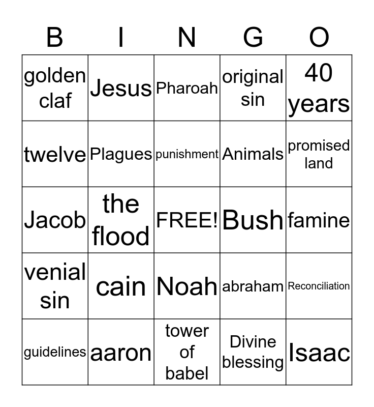 This bingo card has a free space and 24 words: cain, aaron, punishment, guidelines, 40 years, golden claf, twelve, Jesus, Bush, Noah, Animals, Jacob, abraham, Reconciliation, Plagues, Divine blessing, famine, Pharoah, promised land, the flood, Isaac, venial sin, original sin and tower of babel.