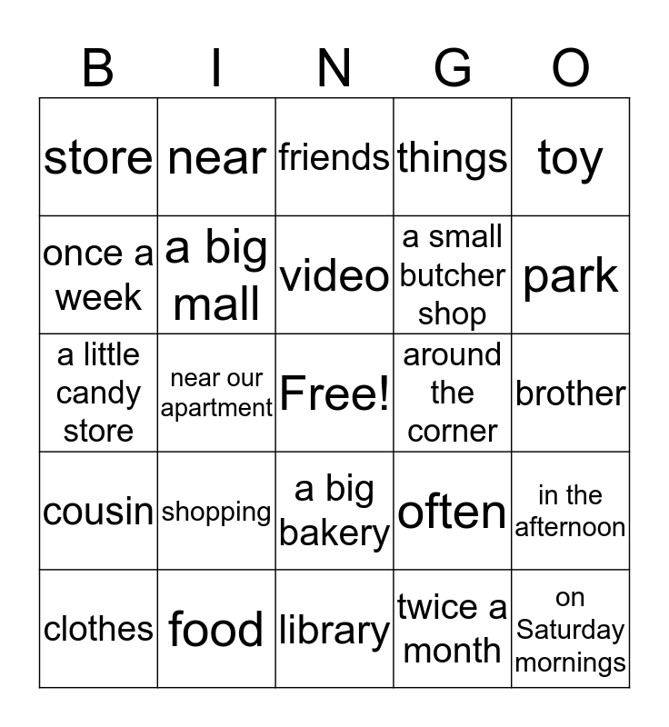 This bingo card has a free space and 24 words: shopping, food, video, clothes, toy, store, once a week, near, around the corner, a big bakery, a small butcher shop, a little candy store, often, in the afternoon, a big mall, twice a month, brother, friends, park, near our apartment, on Saturday mornings, cousin, things and library.