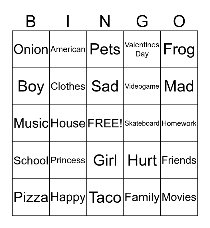 This bingo card has a free space and 24 words: Princess, Happy, Sad, Pizza, Frog, Onion, Boy, American, Skateboard, Girl, Videogame, Music, Hurt, Friends, Clothes, Family, Homework, Pets, Mad, House, Movies, School, Valentines Day and Taco.