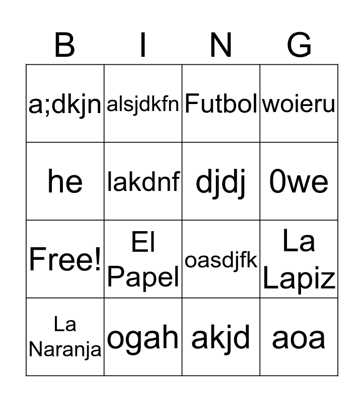 This bingo card has 20 words: La Lapiz, El Pollo, Futbol, La Vaca, La Naranja, he, ogah, a;dkjn, Free!, alsjdkfn, El Papel, oasdjfk, lakdnf, aoa, djdj, o,a e, 0we, woieru, akjd and kwid.