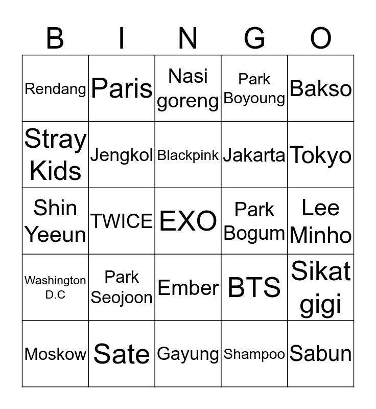 This bingo card has 25 words: Park Seojoon, Gayung, Blackpink, Moskow, Bakso, Rendang, Stray Kids, Paris, Park Bogum, Ember, Jakarta, Shin Yeeun, BTS, Sikat gigi, Jengkol, Sabun, Lee Minho, Nasi goreng, Tokyo, TWICE, EXO, Sate, Washington D.C, Park Boyoung and Shampoo.