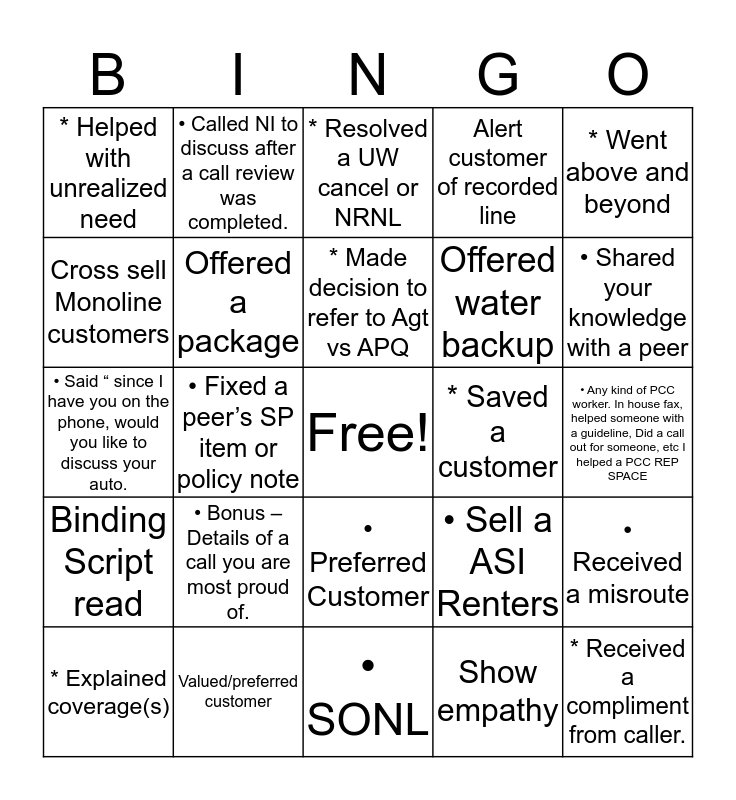 This bingo card has a free space and 59 words: Own the call, Valued/preferred customer, FCRA read, Binding Script read, Show empathy, Read binding script, Offered a package, Reviewed coverages, Offered water backup, Outbound call, Alert customer of recorded line, Go to QBE Policy to get UWC or NR details, Cross sell Monoline customers, Offer to requote auto if existing customer is breaking even on an APQ, *Thank you for being a preferred customer., * Helped with unrealized need, * Received a compliment from caller., * Went above and beyond, * Assisted on auto or offered, * Made decision to refer to Agt vs APQ, * Saved a customer, * Resolved a UW cancel or NRNL, * Explained coverage(s), • Received a misroute, • Said something kind to a co-worker, • Identified an error, corrected it., • Made a policy change, • Reached out to partner, • Shared your knowledge with a peer, • Audited your work items in SP, • Not clocking out until 8….(staying logged in until end of shift), • Helped out a worker !, • Said “ Thank you for calling providing that information”., • Followed through, followed up on a policy., • Called NI to discuss after a call review was completed., • Updated a lienholder, • Requested a Docusign be completed, • Fixed a peer’s SP item or policy note, • Offered a policy review on Auto, • Said “ since I have you on the phone, would you like to discuss your auto., • Found an item in SP that’s a duplicate or the insured already called in before we called/emailed., • Bonus – Details of a call you are most proud of., • Any kind of PCC worker. In house fax, helped someone with a guideline, Did a call out for someone, etc I helped a PCC REP SPACE, • -Offer an additional policy to a monoline insured, • -Service someone with the same name as a celebrity or fictional character, • -Get 3 voicemails in a row for outbound, • -Get 3 human answers in a row for outbound, • Read FCRA, • Preferred Customer, • SONL, • PCC Rocks, • Binding Restrictions, • Submit Timesheet., • Did the customer call us back? For the love of EVERYTHING that is good, it never gets filled in, • Acknowledge TRT, • Sell a ASI Renters, • Save a Home, • Non Renewal for each company and • UW Cancels for each Company.