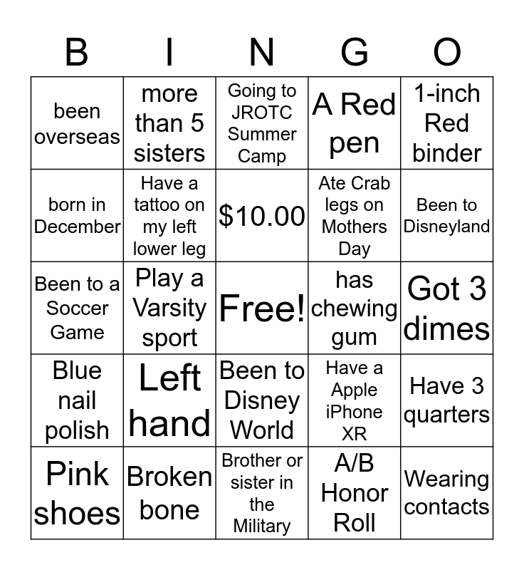 This bingo card has a free space and 24 words: Left hand, Broken bone, $10.00, Pink shoes, 1-inch Red binder, been overseas, born in December, more than 5 sisters, has chewing gum, Been to Disney World, Ate Crab legs on Mothers Day, Been to a Soccer Game, Have a Apple iPhone XR, Have 3 quarters, Have a tattoo on my left lower leg, A/B Honor Roll, Got 3 dimes, Going to JROTC Summer Camp, Been to Disneyland, Play a Varsity sport, Wearing contacts, Blue nail polish, A Red pen and Brother or sister in the Military.