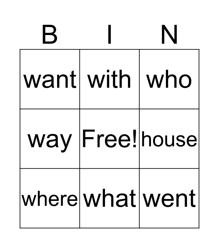 This bingo card has a free space and 10 words: what, who, want, went, way, where, with, how, house and when.