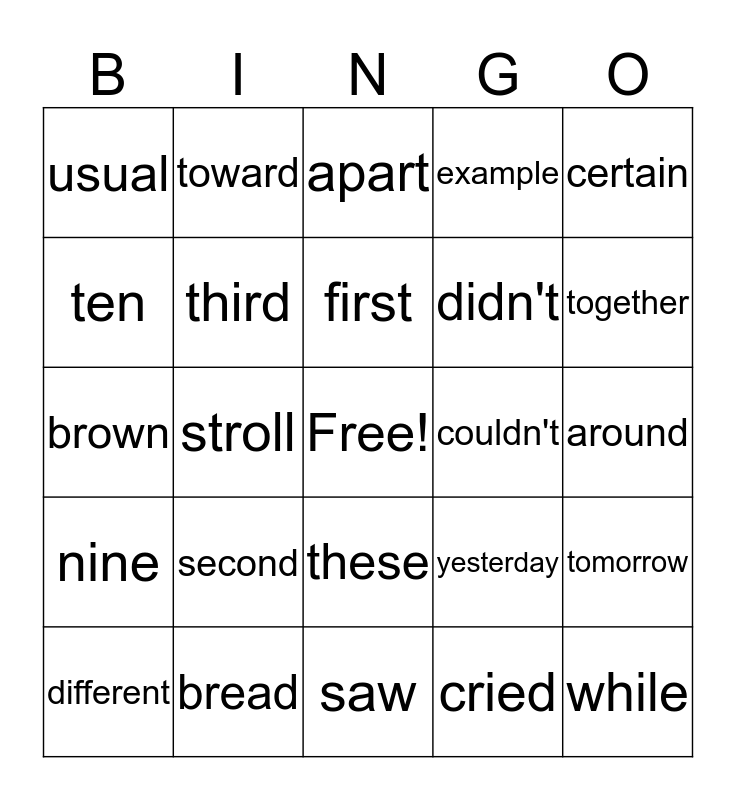 This bingo card has a free space and 39 words: Beautiful, brought, thought, yesterday, tomorrow, nine, stroll, eight, couldn't, around, ten, toward, laugh, together, brown, second, these, example, explain, different, third, first, cried, certain, frown, bread, saw, badge, use, usual, won't, alone, didn't, while, enough, between, apart, which and once.