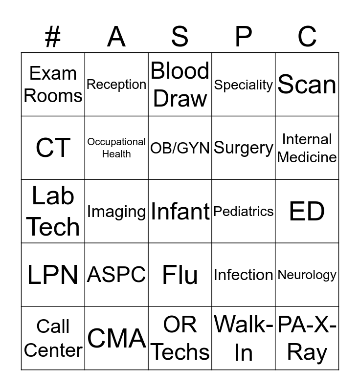 This bingo card has 27 words: Infection, PA-X-Ray, Surgery, OR Techs, CT, Blood Draw, Reception, LPN, Pediatrics, Neurology, Lab Tech, Speciality, Call Center, CMA, Internal Medicine, Providers, Occupational Health, OB/GYN, ASPC, Exam Rooms, ED, Walk-In, Imaging, Infant, Flu, Scan and Schedule.