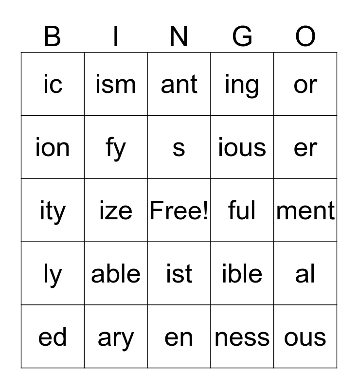 This bingo card has a free space and 24 words: able, ary, s, ed, or, ic, ion, ism, ful, ist, ious, ity, ible, al, fy, ness, ment, ant, er, ize, ous, ly, ing and en.
