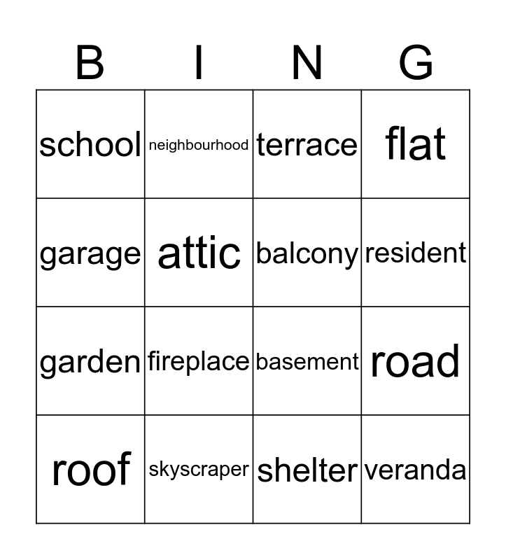 This bingo card has 16 words: skyscraper, road, terrace, school, garden, neighbourhood, basement, shelter, garage, attic, roof, flat, fireplace, resident, balcony and veranda.