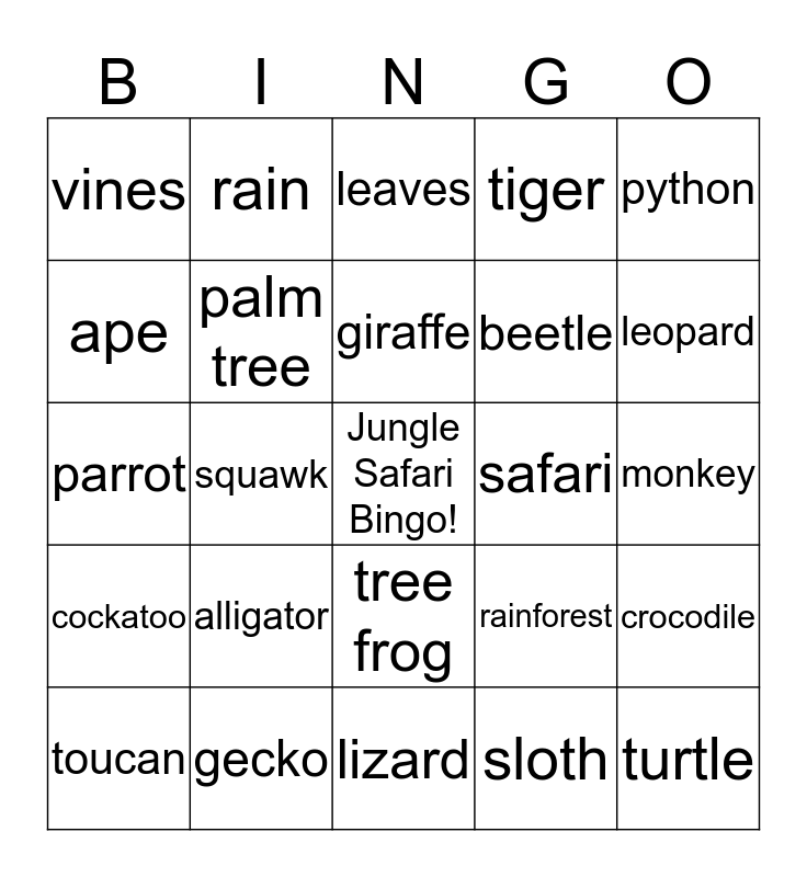 This bingo card has a free space and 24 words: alligator, gecko, giraffe, toucan, python, vines, ape, rain, safari, tree frog, beetle, parrot, rainforest, crocodile, palm tree, sloth, monkey, leaves, leopard, squawk, turtle, cockatoo, tiger and lizard.