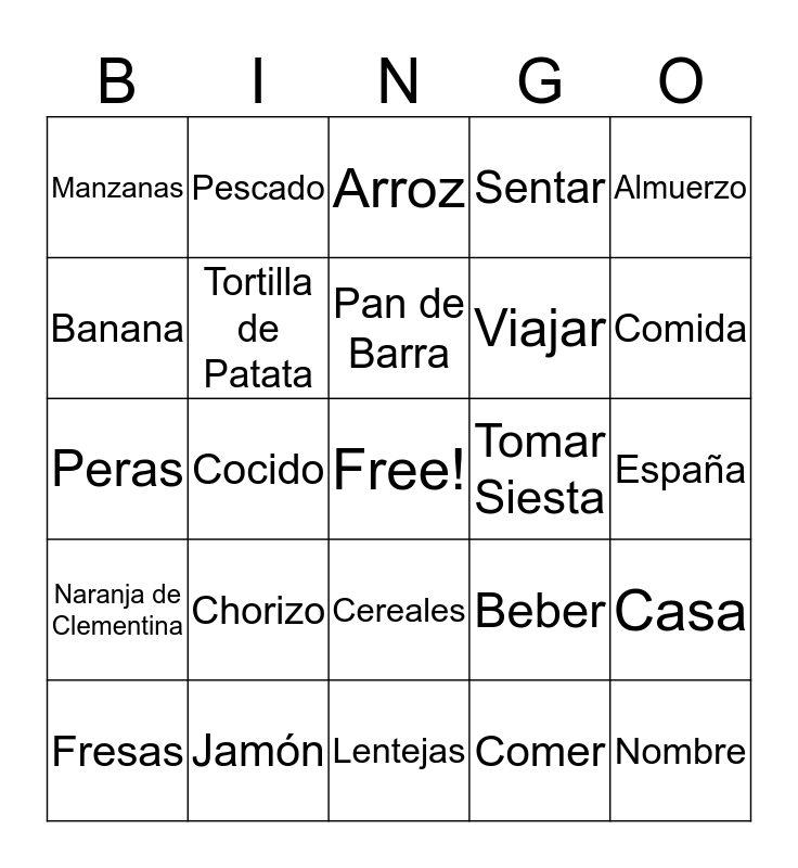 This bingo card has a free space and 24 words: Fresas, Chorizo, Pan de Barra, Comer, Almuerzo, Manzanas, Pescado, Arroz, Tomar Siesta, España, Peras, Tortilla de Patata, Beber, Casa, Banana, Jamón, Lentejas, Sentar, Comida, Naranja de Clementina, Cocido, Cereales, Viajar and Nombre.