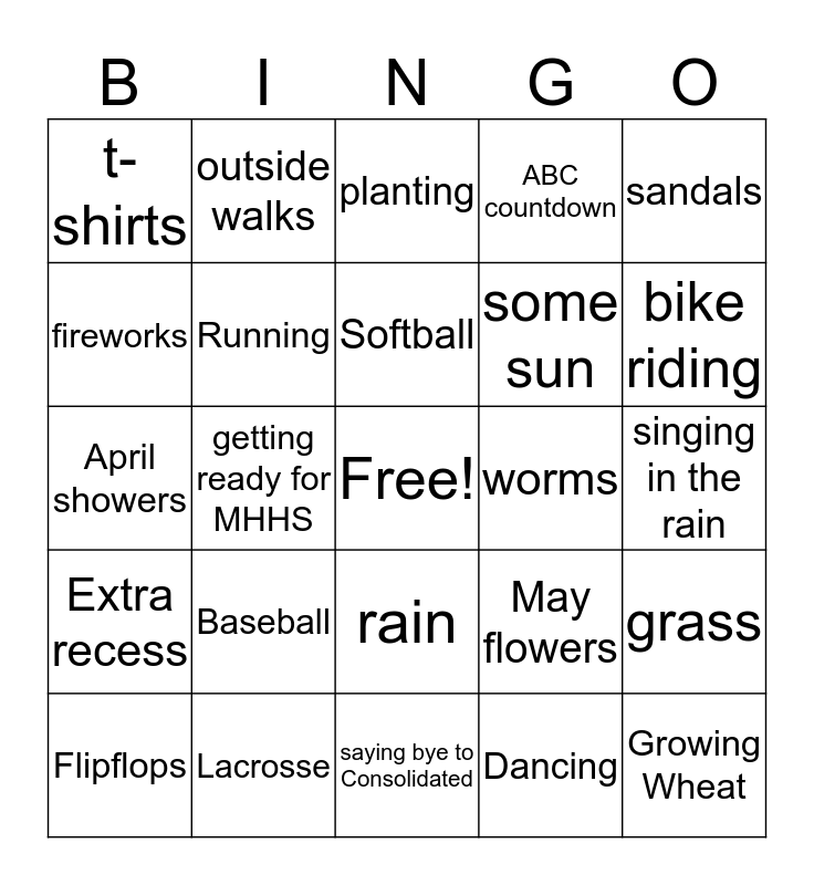This bingo card has a free space and 24 words: Baseball, Lacrosse, Softball, Flipflops, sandals, t-shirts, fireworks, outside walks, worms, rain, some sun, April showers, May flowers, grass, Running, Dancing, singing in the rain, planting, bike riding, getting ready for MHHS, Growing Wheat, Extra recess, ABC countdown and saying bye to Consolidated.