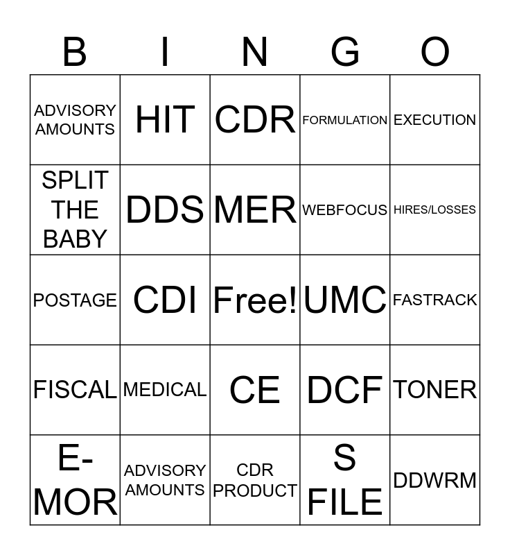 This bingo card has a free space and 24 words: MEDICAL, ADVISORY AMOUNTS, MER, E-MOR, EXECUTION, ADVISORY AMOUNTS, SPLIT THE BABY, HIT, UMC, CE, WEBFOCUS, POSTAGE, DCF, TONER, DDS, S FILE, FASTRACK, CDR, HIRES/LOSSES, CDI, DDWRM, FISCAL, FORMULATION and CDR PRODUCT.