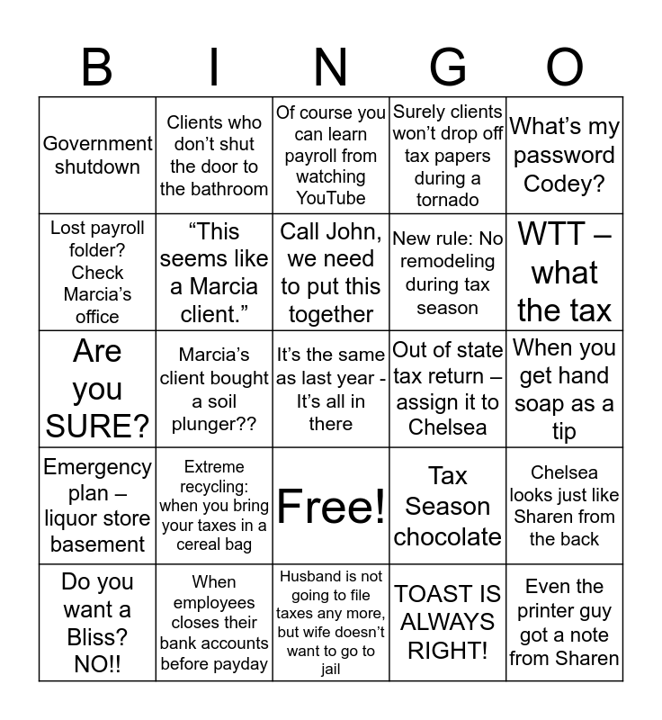 This bingo card has 26 words: Free!, TOAST IS ALWAYS RIGHT!, Call John, we need to put this together, When employees closes their bank accounts before payday, What’s my password Codey?, Government shutdown, Lost payroll folder? Check Marcia’s office, Clients who don’t shut the door to the bathroom, When you get hand soap as a tip, Tax Season chocolate, New rule: No remodeling during tax season, Are you SURE?, Chelsea looks just like Sharen from the back, Do you want a Bliss? NO!!, Marcia’s client bought a soil plunger??, When you already printed the return but they “just got another paper”, Surely clients won’t drop off tax papers during a tornado, Emergency plan – liquor store basement, Of course you can learn payroll from watching YouTube, It’s the same as last year - It’s all in there, WTT – what the tax, Husband is not going to file taxes any more, but wife doesn’t want to go to jail, Out of state tax return – assign it to Chelsea, Extreme recycling: when you bring your taxes in a cereal bag, “This seems like a Marcia client.” and Even the printer guy got a note from Sharen.