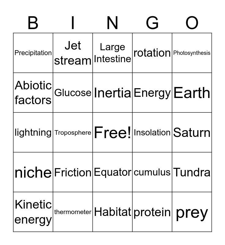 This bingo card has a free space and 25 words: Friction, Habitat, Inertia, Kinetic energy, Photosynthesis, Precipitation, Abiotic factors, Jet stream, Insolation, Equator, Energy, lightning, cumulus, Tundra, Glucose, Small intestine, Saturn, Large Intestine, Earth, Troposphere, prey, thermometer, niche, rotation and protein.