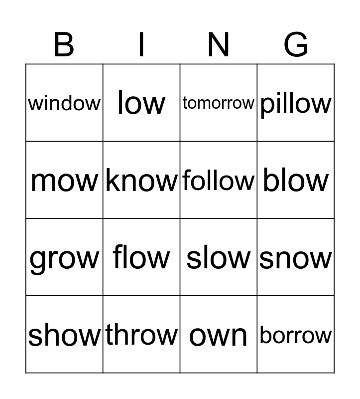 This bingo card has 16 words: show, throw, tomorrow, pillow, mow, low, slow, snow, window, know, own, blow, grow, flow, follow and borrow.