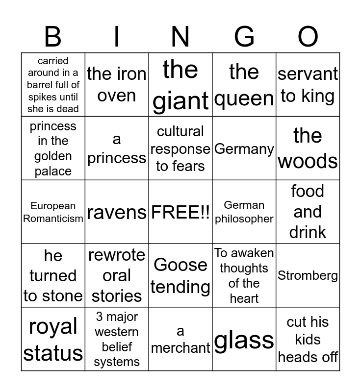 This bingo card has a free space and 24 words: rewrote oral stories, 3 major western belief systems, cultural response to fears, royal status, servant to king, carried around in a barrel full of spikes until she is dead, princess in the golden palace, the iron oven, German philosopher, Goose tending, Germany, European Romanticism, To awaken thoughts of the heart, Stromberg, a princess, glass, food and drink, the giant, the woods, ravens, cut his kids heads off, he turned to stone, the queen and a merchant.