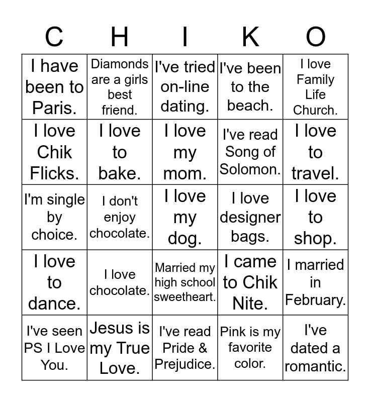 This bingo card has 25 words: I love chocolate., I've read Pride & Prejudice., I love my mom., I've seen PS I Love You., I love Family Life Church., I have been to Paris., I love Chik Flicks., Diamonds are a girls best friend., I love designer bags., Married my high school sweetheart., I've read Song of Solomon., I'm single by choice., I came to Chik Nite., I married in February., I love to bake., I've dated a romantic., I love to shop., I've tried on-line dating., I love to travel., I don't enjoy chocolate., I love my dog., Jesus is my True Love., I love to dance., I've been to the beach. and Pink is my favorite color..