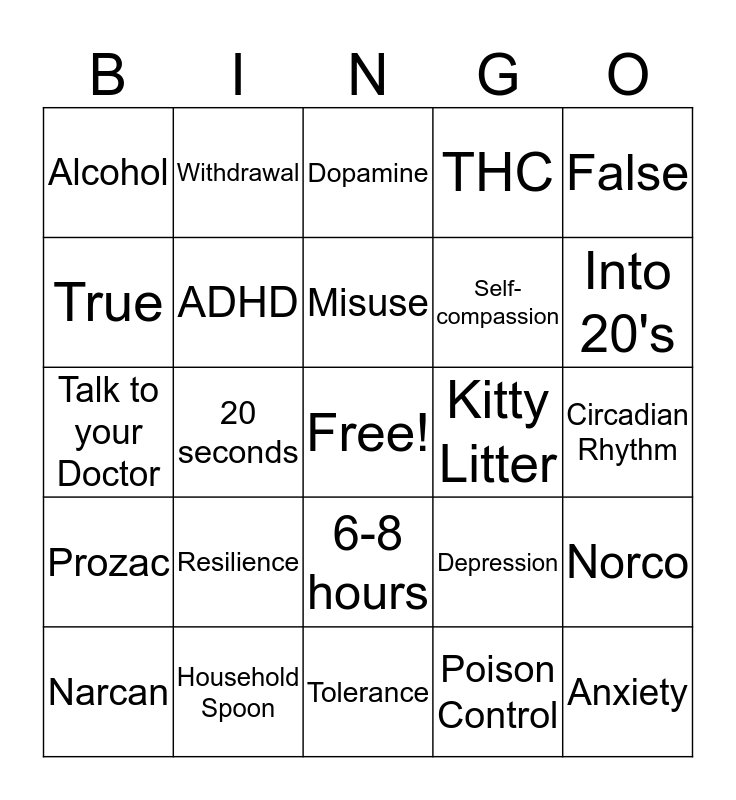 This bingo card has a free space and 27 words: 85%, Household Spoon, Misuse, Poison Control, False, True, Withdrawal, Tolerance, Kitty Litter, Norco, Prozac, ADHD, Depression, Anxiety, Talk to your Doctor, Phobia, Dopamine, THC, Circadian Rhythm, Alcohol, Resilience, 6-8 hours, Self-compassion, Into 20's, Narcan, 20 seconds and October to May.