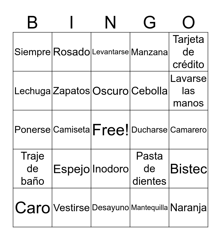 This bingo card has a free space and 33 words: Abrigo, Camisa, Camiseta, Cinturón, Traje de baño, Zapatos, Tarjeta de crédito, Caro, Rosado, Claro, Oscuro, Levantarse, Despertarse, Cepillarse los dientes, Ducharse, Lavarse las manos, Vestirse, Ponerse, Espejo, Pasta de dientes, Inodoro, Rutina diaria, Siempre, Camarero, Desayuno, Naranja, Manzana, Cebolla, Lechuga, Bistec, Café, Mantequilla and Pescado.