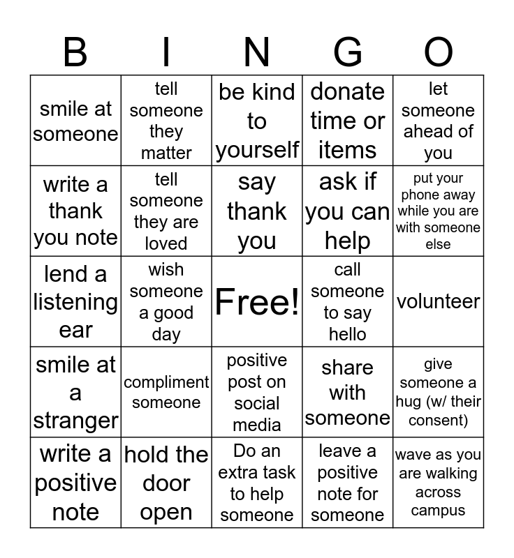 This bingo card has a free space and 24 words: compliment someone, hold the door open, say thank you, write a positive note, let someone ahead of you, smile at someone, write a thank you note, tell someone they matter, call someone to say hello, positive post on social media, ask if you can help, lend a listening ear, share with someone, give someone a hug (w/ their consent), tell someone they are loved, leave a positive note for someone, volunteer, be kind to yourself, put your phone away while you are with someone else, wish someone a good day, wave as you are walking across campus, smile at a stranger, donate time or items and Do an extra task to help someone.