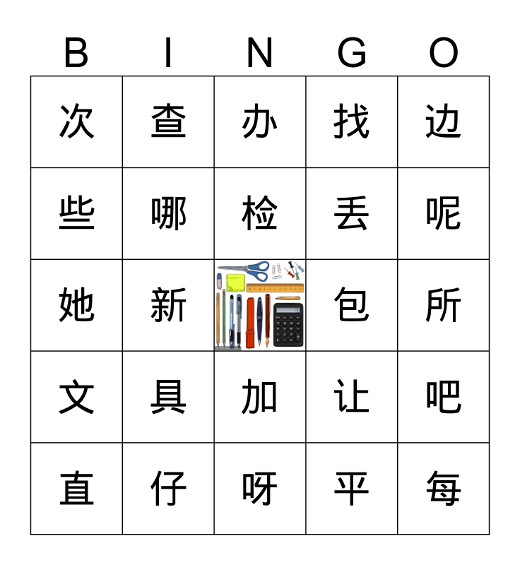 This bingo card has a free space and 24 words: 具, 仔, 检, 直, 边, 次, 些, 查, 包, 加, 丢, 她, 让, 吧, 哪, 平, 所, 办, 呢, 新, 每, 文, 找 and 呀.