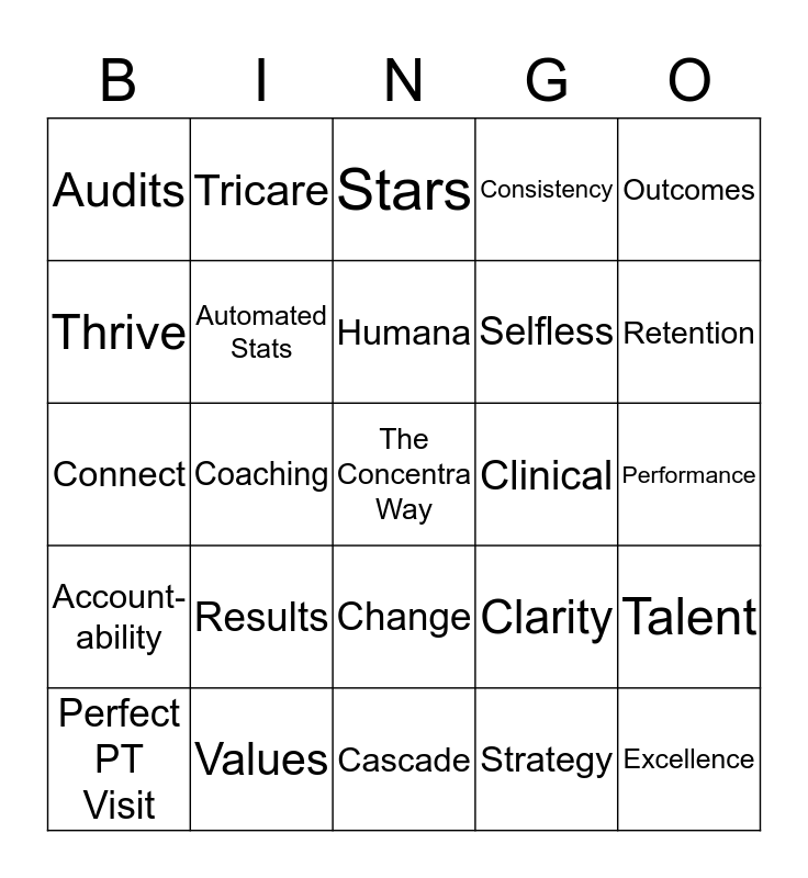 This bingo card has a free space and 34 words: Inspires, Strategy, Orange Book, Leadership, Account- ability, Automated Stats, Outcomes, Perfect PT Visit, Tricare, Urgent Care, Humana, Stars, Quality, Patient, Clinical, Retention, Values, Connect, Results, Clarity, Change, Net Promoter Score, Audits, Performance, Cascade, Excellence, Consistency, Success, Selfless, Thrive, Initiatives, Coaching, Talent and Criteria.